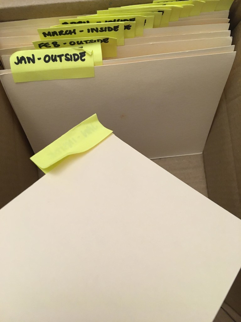 I did try making some dividers with some bits of card and folded over post it notes but the post it notes got a bit squished. I then realised that a flap was not necessary, and we could repurpose cardboard further and easily make divers from with the cardboard flaps of the bigger cardboard that we get deliveries in. This was a quick and easy step.