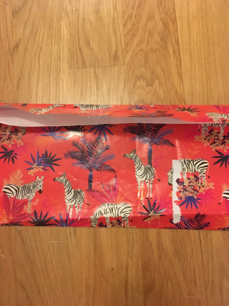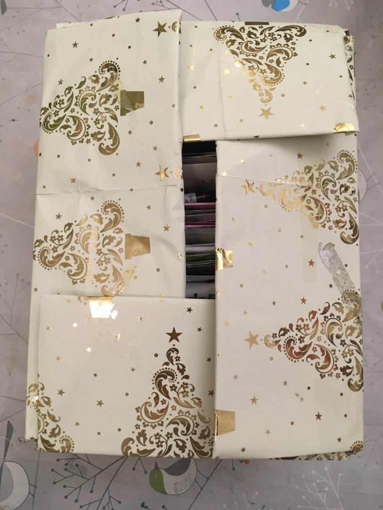 With the cards I found some used Christmas paper. So …er…definitely a hoarder. I often try and keep big, not so crumpled paper after unwrapping. I always assume I could reuse it but by the next Christmas I can never find any of the paper I had put away and/or I realise that it doesn’t look very nice and/or the Sellotape glue reside on it has gone a bit funny. I decided that this paper was perfect for covering a box. I had 2 similar looking boxes and whilst it was easy to tell by looking inside which box was mine and which one was school’s. It got a bit tedious having to check every time. At one point I even had a third box that I was building for someone.