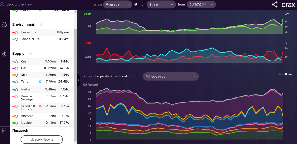 As I understand it, these figures include energy consumption, transport, products and services. There will be some things that are improving as countries turn their energy sources over to more renewable sources. Here we can look at the Drax website and you can see what percentage of the UK’s energy is derived from which source. If you compare 10 years ago to last year, in rough figures – coal went down from 30% to 2%, gas also came down from 47% to 35%, wind went up from 3% to almost 25%, nuclear didn’t move much from around 17% and hydro, solar and biomass combined have gone from almost zero to 13%.