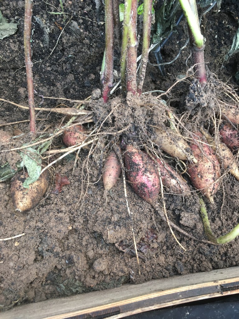 Jerusalem artichoke – This is a new one for us this year. I was surprised at just how much food they produced for the amount of ground space needed. They do grow very tall though (ours were about 10 ft) so plan carefully where to grow them. They too can be stored in the ground (if there isn’t a hard freeze) and become sweeter with a frost. They also store fine in a fridge for a couple of weeks. The skins can be left on and they are lovely roasted or sauteed. You need to leave a couple of tubers to grow the following year. Raw they have a texture and taste a bit like nutty waterchestnuts. Cooked they are like potato and taste quite like steamed artichoke hearts. Click for more info.