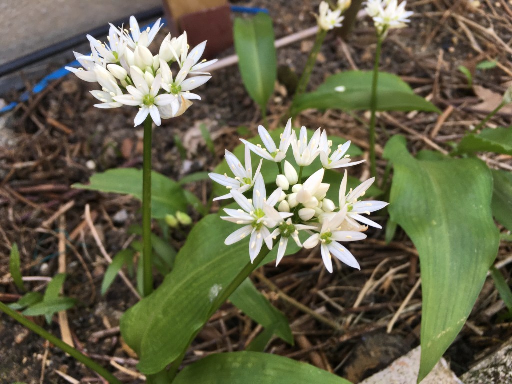 The scientific name is Allium ursinum, also called ramsons and bear garlic and unlike most alliums it has very broad lanceolate leaves that curl outwards as they grow. Their white flowers are fairly typical for alliums, but they don’t form balls the way most allium flowers do. They look very similar to the flowers of Chinese (also called garlic) chives.