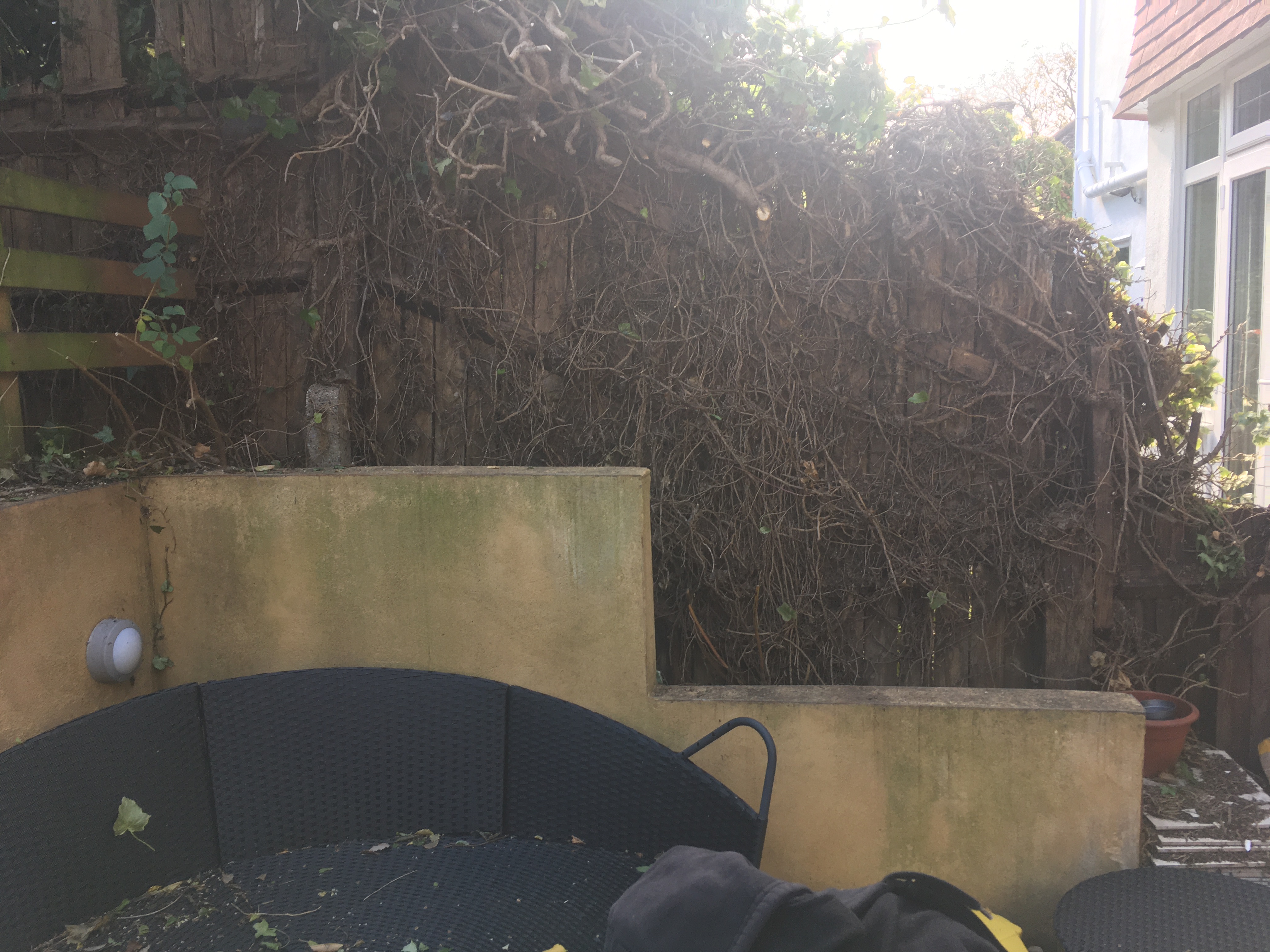 The ivy was sticking out into the patio by about 1m. The gap between the wall and the fence is about a 1m. Doesn’t look great bare, but now something can be grown in that space.
