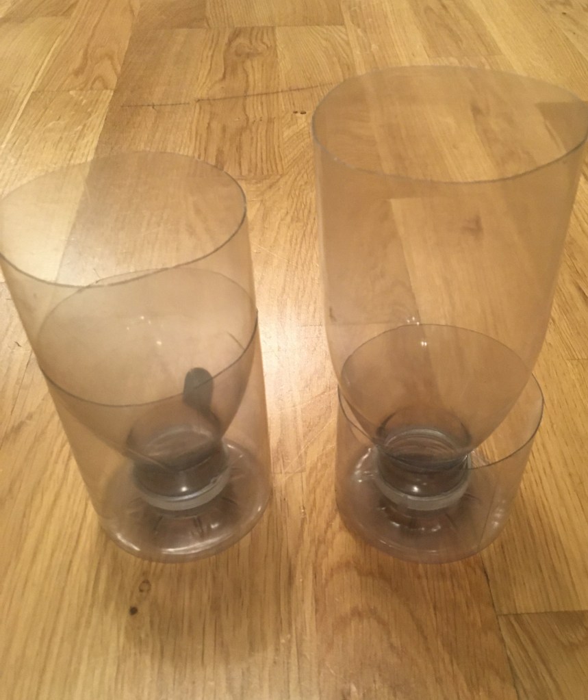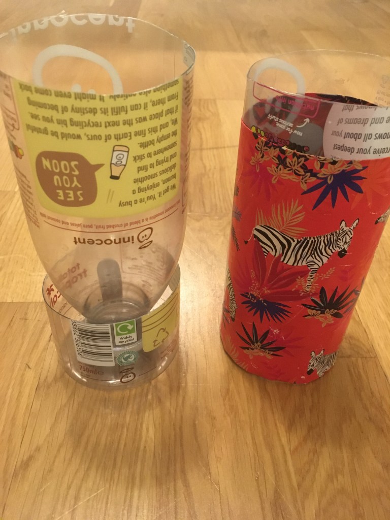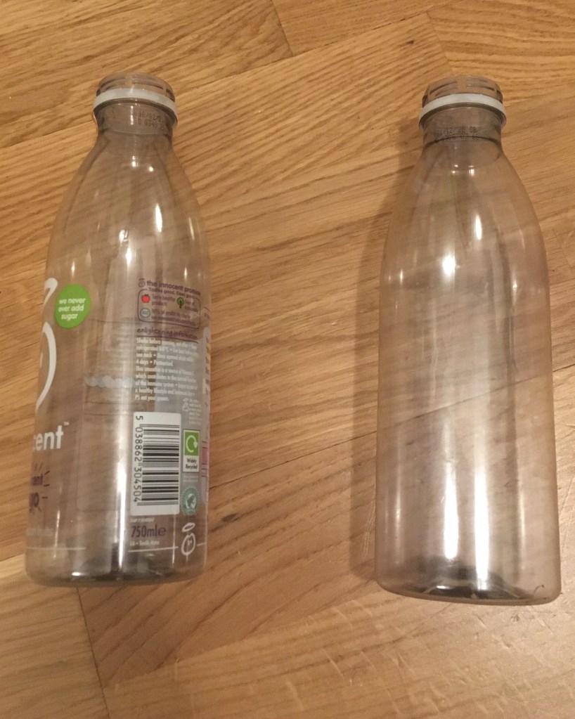 1. Plastic bottles smaller than 1.5litres may be a bit small for the effort. If the label is easy to remove then do so. It turns out that the innocent smoothie bottles are best left with the label on. The glue doesn’t come of very easily. Just FYI – rubbing with oil can sometimes work on glue that is not water soluble.