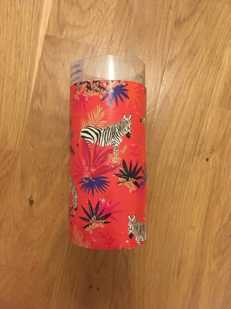 This is the quickest method and also fantastic for using up old wrapping paper. It’s worth getting a bigger piece and folding the ends over. It’s quicker because it means less cutting and it also gives you a thicker sheath to go around the pot. This is particularly good for when you’ve got a pot that has too short a base. You can extend the height of the wrapping paper past the bottom section so that it forms a taller base for your top pot. Hopefully with careful watering and not over watering your paper shouldn’t get wet. I have tried to use the Christmas paper that is less obviously Christmas themed. Little one is a big fan of cats and this pink monstrosity is what her last birthday pressie came wrapped in.