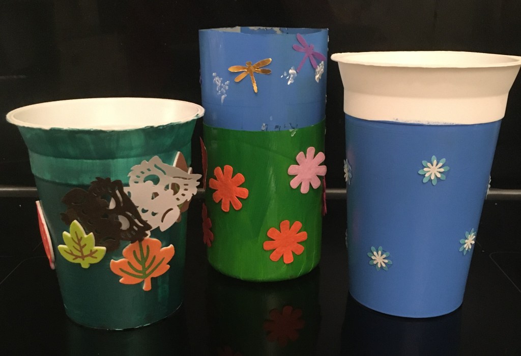 You can decorate repurposed recycling containers for both aesthetics and functionality. Here are some details on how to make both a pot with drainage and a base to collect the drips from a single plastic bottle There are some decorating ideas that involve reusing old wrapping paper, paint and craft bits. It is a great activity for little ones and it ticks a few home schooling boxes whilst being free and involving no screen time.