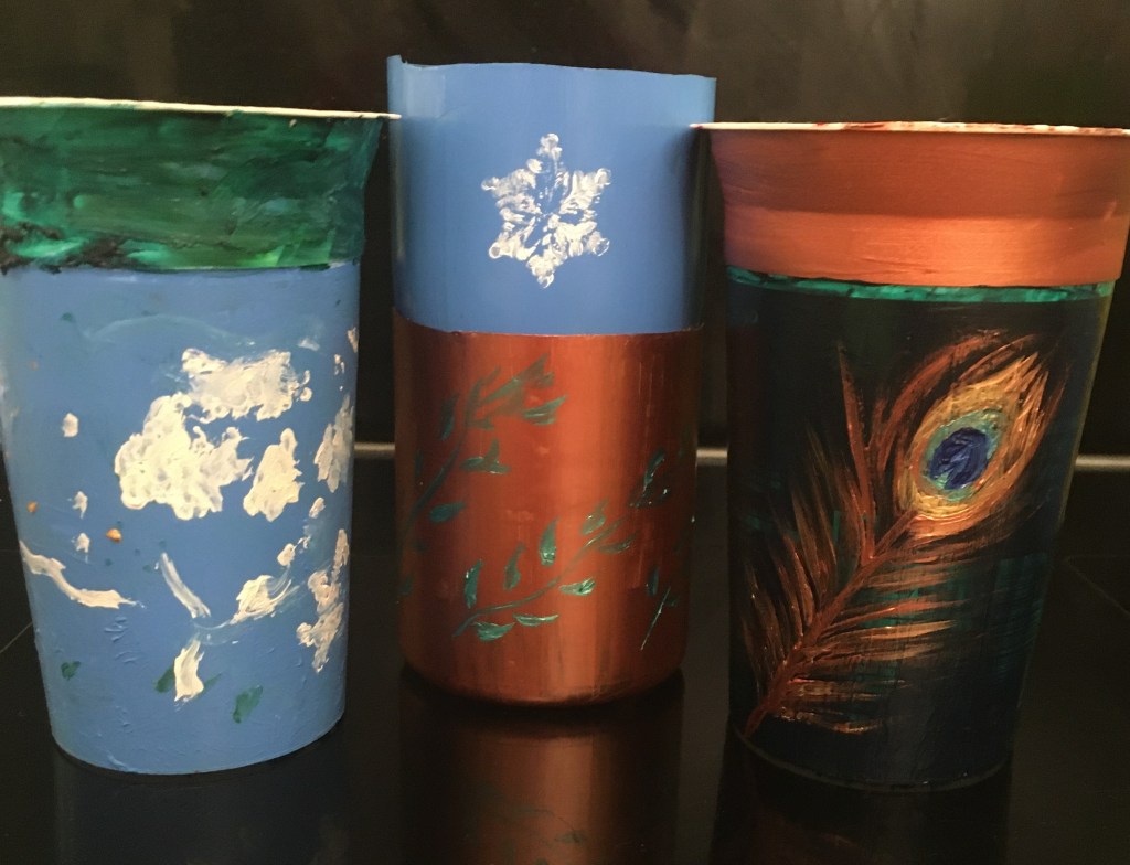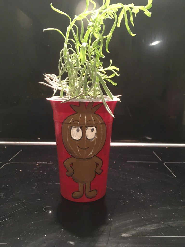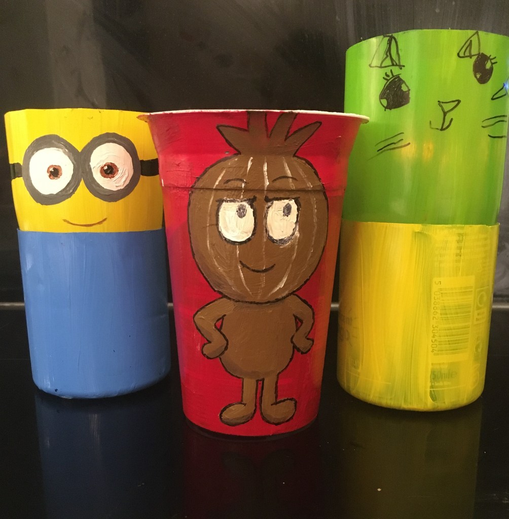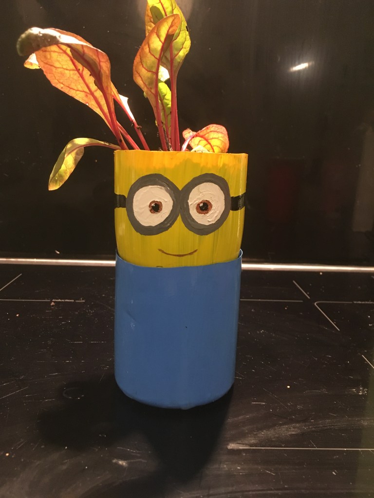 You can paint pretty designs on any kind of repurposed recycling pot as well as the repurposed plastic bottle pots. I’d advise using acrylic paint as it can be used on plastic and is waterproof afterwards. My little one had lots of fun making this pot with clouds. Quite a fun design is to draw a face on the pot and then whatever grows in the top of your pot looks like it is the pot’s hair. Again, you can see the little one loves cats, with this cat face she drew. I may be one of those awful coo-ing mothers, because I really think this is adorable and pretty good for a 5 year old. Hopefully, you can tell that one of these below is a minion. The other is a, slightly more obscure, vittra from ‘Hilda’ – who do actually have greenery out the top of their heads.
