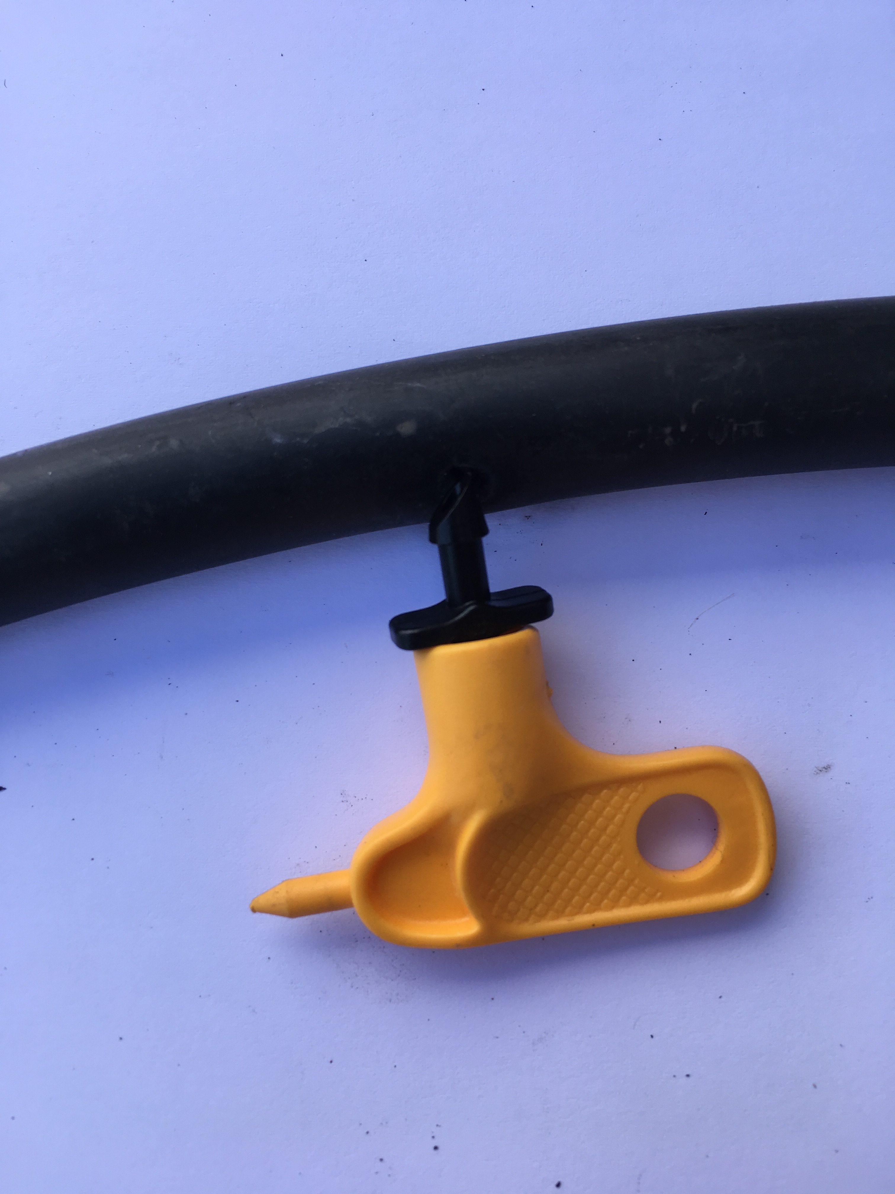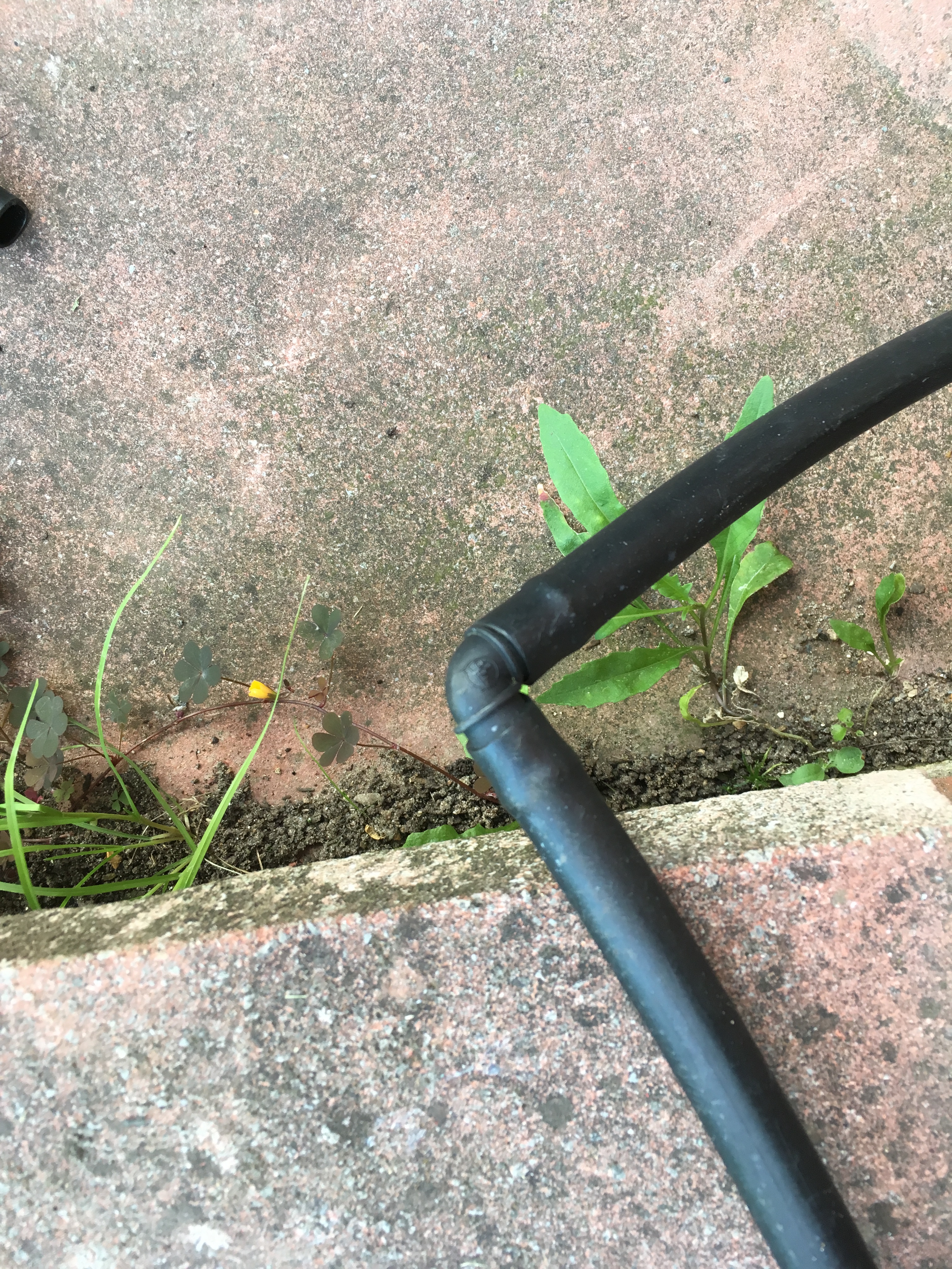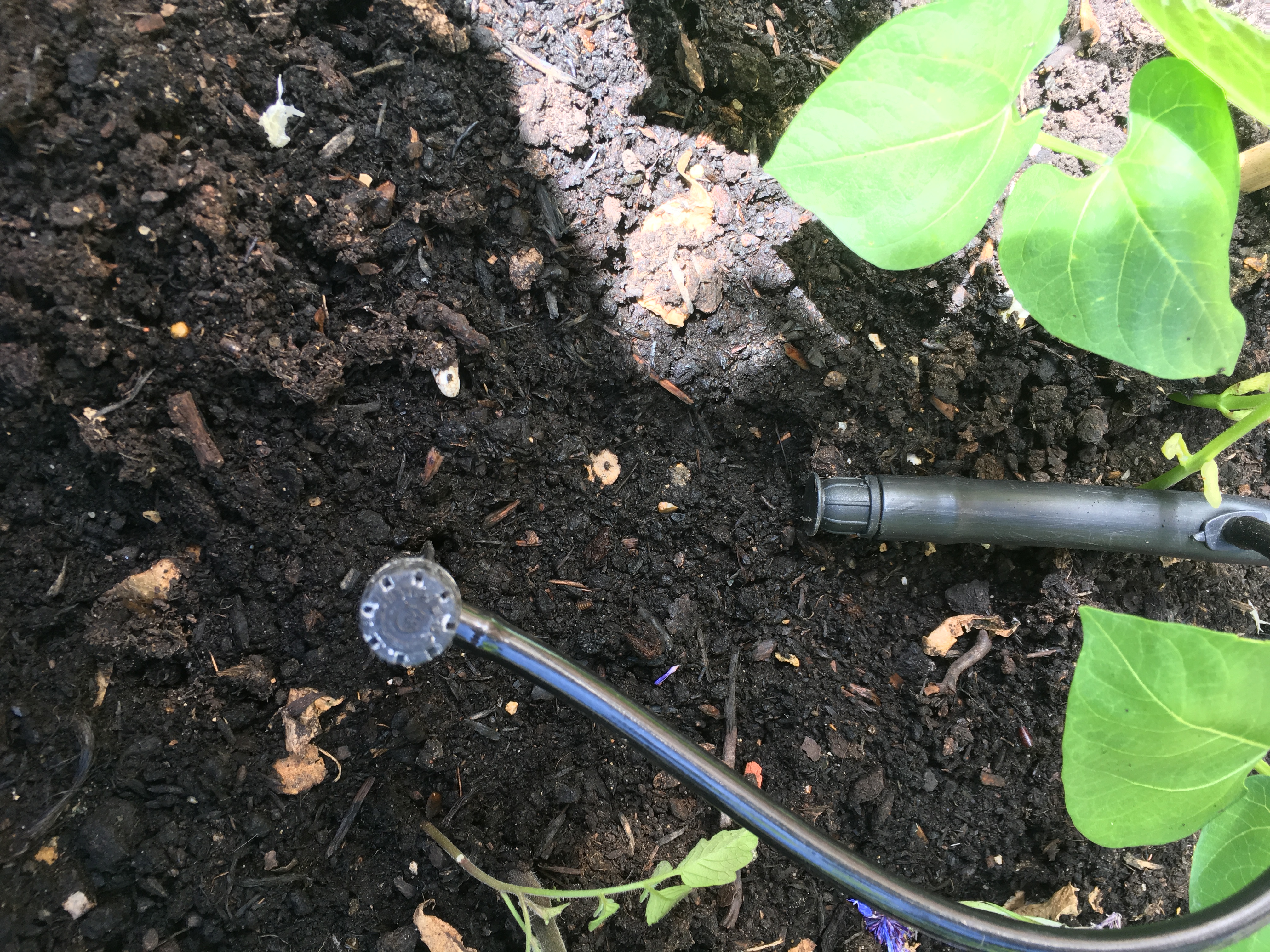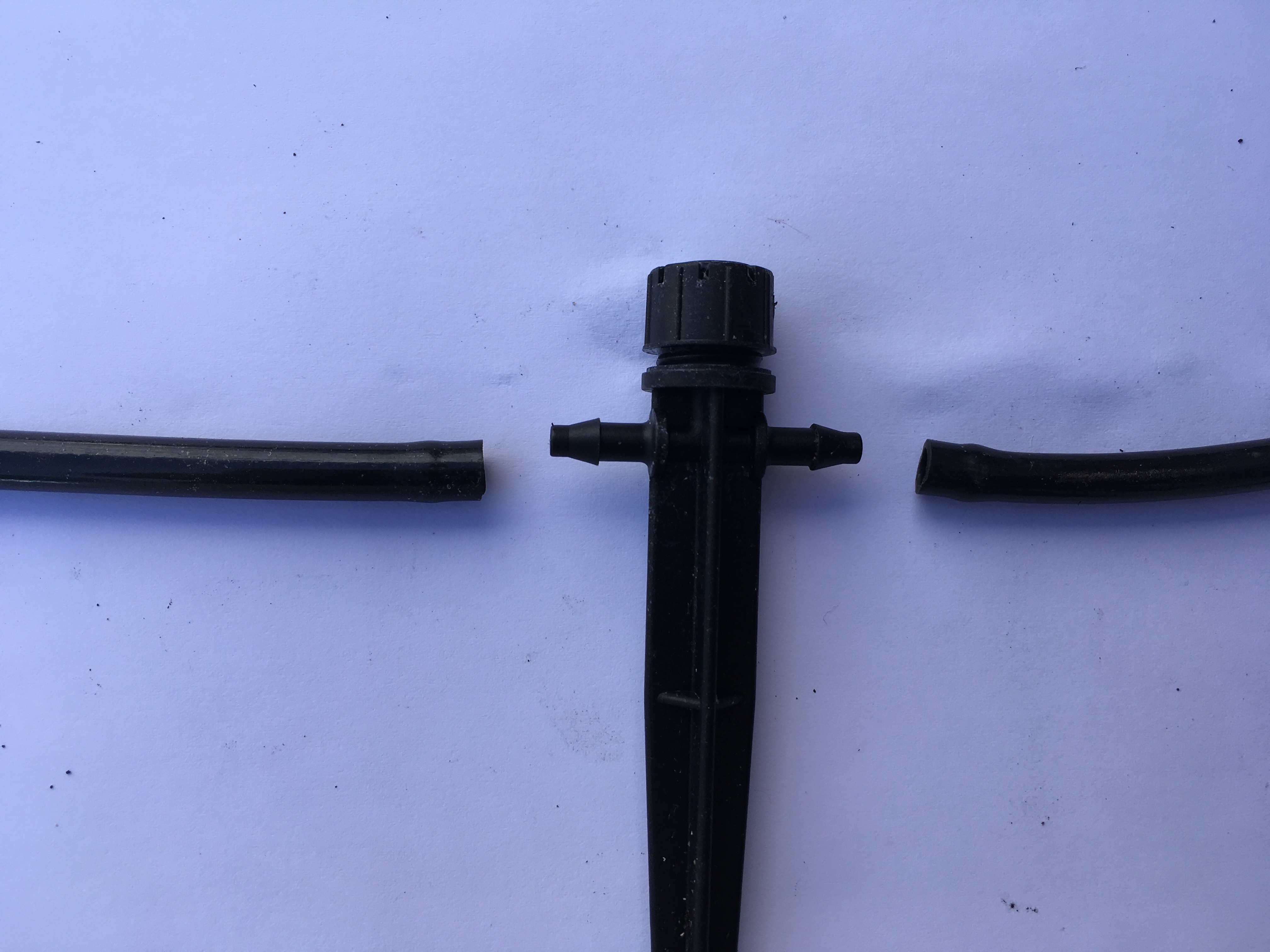 Middle right you can see a stopper at the end of the 13mm pipe. If you look right of that you can see a connector with the 4mm pipe that leads to a mini sprinkler middle left. The top of the mini sprinkler can be twisted to increase or decrease flow.
