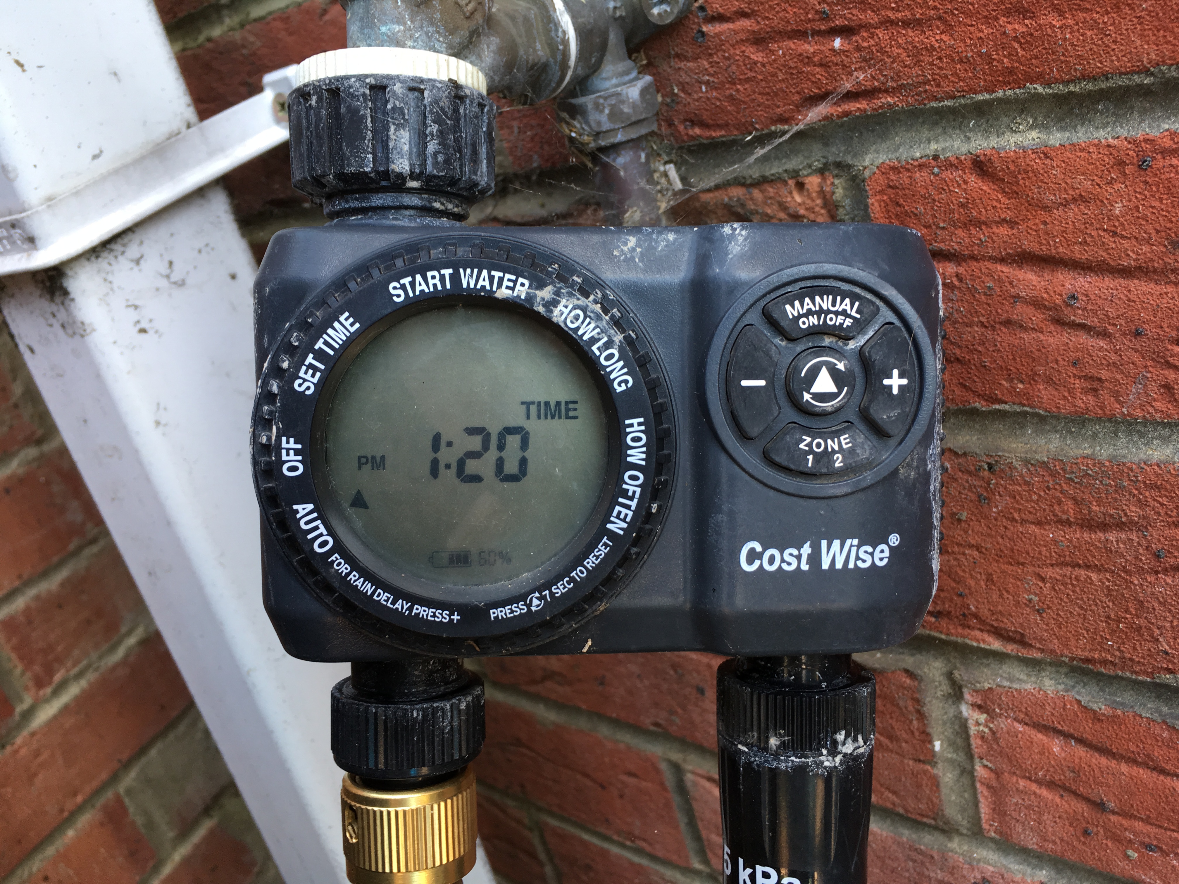 This timer gives us 2 outlets. The right is connected to the irrigation system. The left is connected to a hose which is occasionally connected to a sprinkler or a cat scarer. You can press the MANUAL ON/OFF to allow flow for a chosen number of minutes. The 2 outlets can be chosen independently.