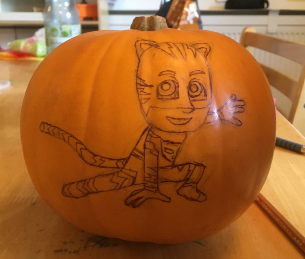 I gave another pumpkin to my little one to draw. This is supposed to be a 4 eyed monster head on legs.