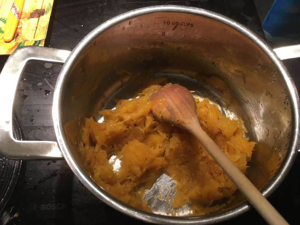 Scoop out the seeds which you could roast and eat. Use a sturdy tablespoon to scrap out the insides until the whole shell is around 1.5cm thick. It will take some welly. If in doubt leave it thicker. You can always scrape more out after if it’s too thick.