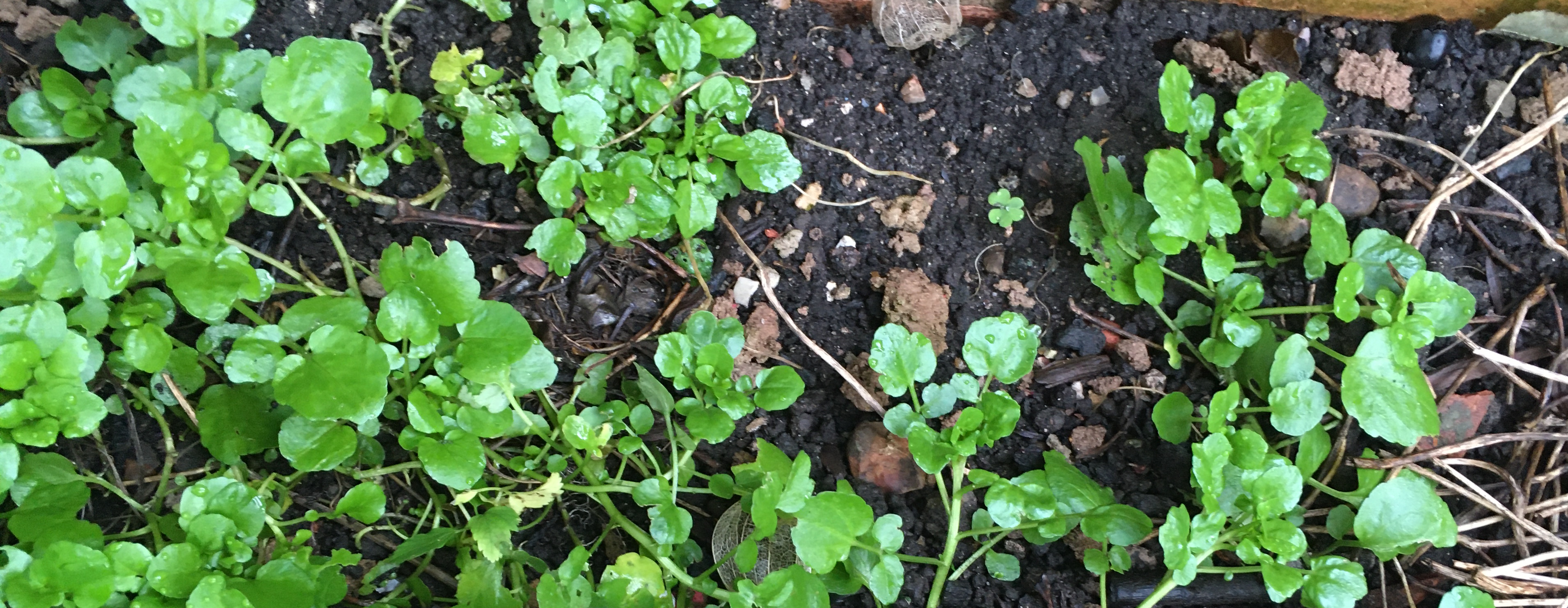Watercress growing around an artichoke plant. The watercress started growing from a stem that was chucked into the compost tub. This was taken on the 19th December so this is a helpful little salad green in the winter.