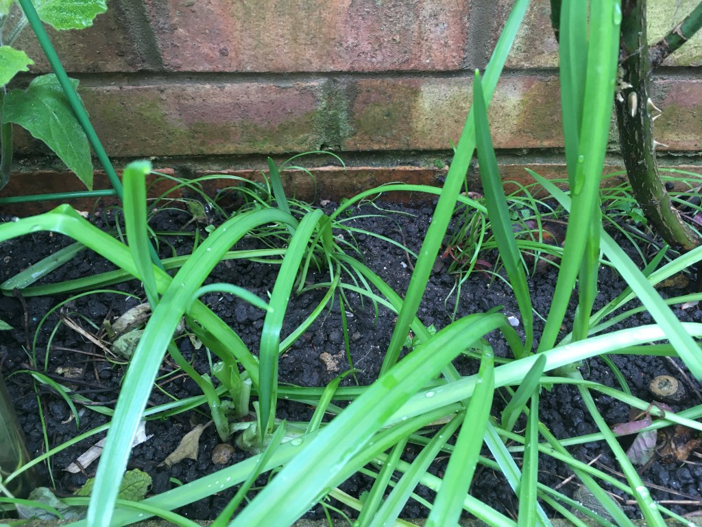 Having seen first-hand how invasive it can be I dug my new 20 odd bulbs into an enclosed bed in the front garden, under the roses. I didn’t want to keep the roses, but did because the little monkey loves them, they smell lovely and roses are apparently edible (something to explore this year maybe). Three cornered leek does fine with shade and grows very weedily so I figured it would survive regardless of rubbish conditions. Boy was I right. I left them fo r a year to acclimatise and didn’t harvest anything to let them establish. The next spring though there were plenty of new seedlings and the older plants have come back thicker and longer. This is a rampant self seeder.