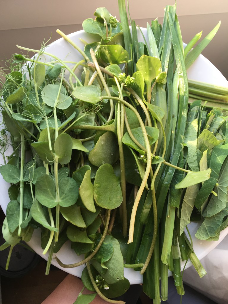 1. Well, it will take over if not contained, but… the fun challenge is to EAT it into submission. It’s mild so it’s easy to use as a vegetable. I just had to look up ‘stinking iris’… does it really smell beefy?