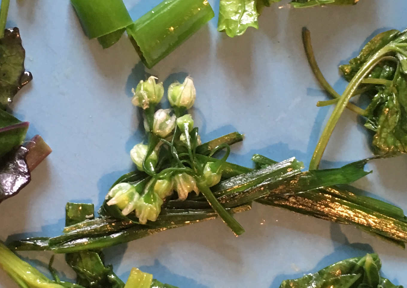 The leaves have a sweet, mild garlicy/oniony flavour. They are great raw or fried lightly. If you add them into any dishes, add them right at the end, otherwise you lose a lot of the flavour. The flowers are lovely and sweet in salads. They too carry the allium taste. The young green seed pods keep a lovely crunch when lightly cooked and are very sweet and almost fruity. It sounds terrible, but I thought of lychees. Yes… and oniony lychee sounds foul… if you’re expecting lychee and get onion. However, if you’re just expecting onion and you get a fresh fruity added flavour then it is lovely. Basically, the seed pod is the fruit of the plant, like a tomato or a berry. Sound less icky? The bulbs have a sweet mild garlic flavour.