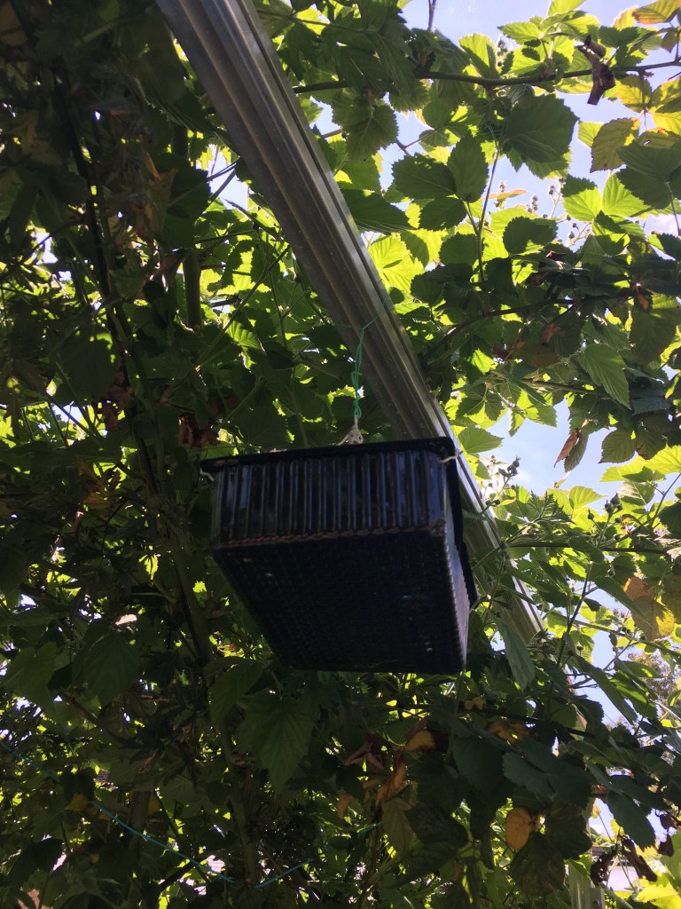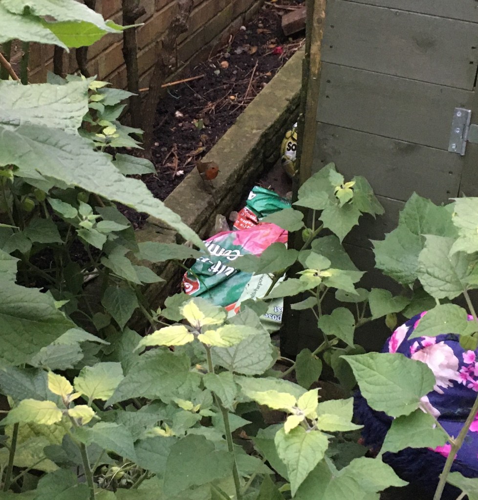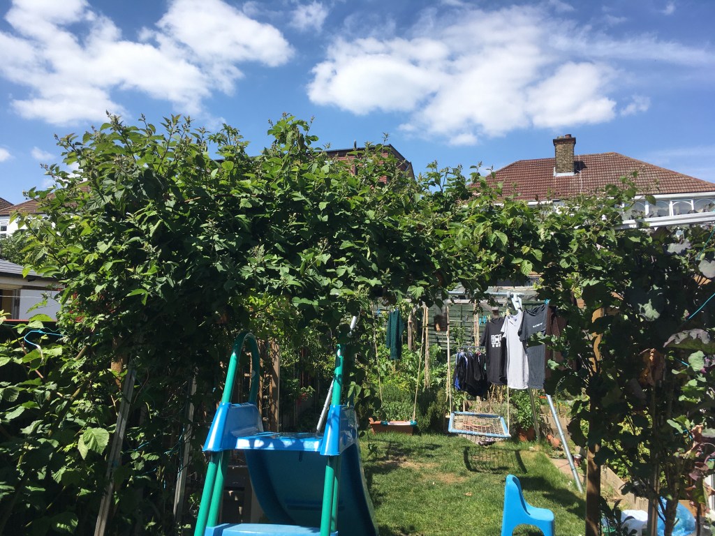 There it is to the right of the apple tree, behind the raised bed. You can see the sun doesn’t reach it. That was taken after the first harvest.