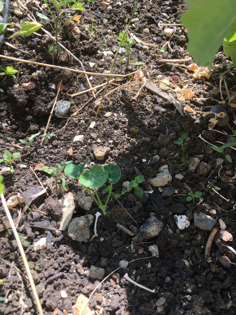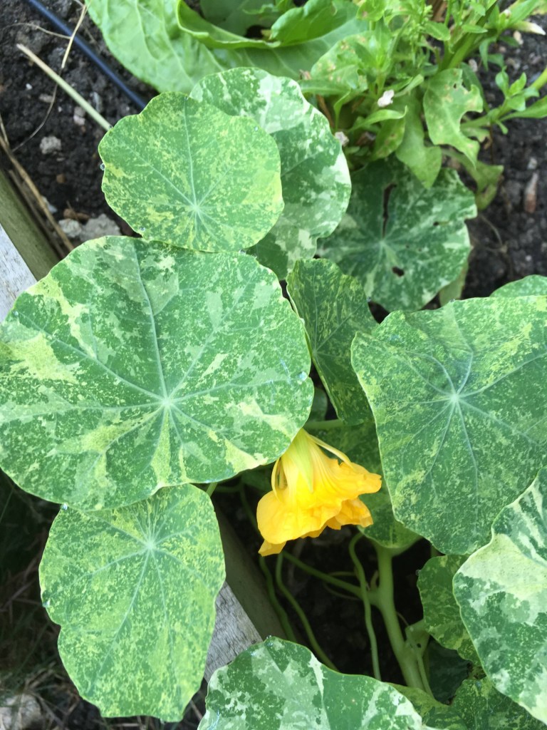I sowed nasturtiums in 2017. They can be sown indoors, in individual pots, just before the last frost. Individual toilet roll pots are best because the stems are easily snapped. For ease sow in situ in from April onwards. I planted the variety ‘Gleam’ as they are a climbing variety and an ‘African Jewel’ mix, another climbing variety which also has variegated leaves for something cool to look at. Since then they’ve come back every year without any intervention from me. One of the great things about edible self-seeders like these is that any unwanted seedlings can just be pulled and eaten.
