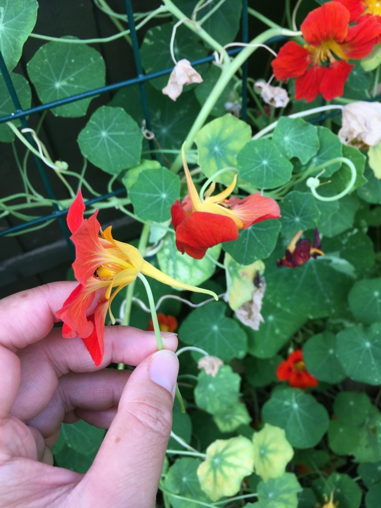 I’m surprised that people still visit me when I often chase guests with things I’ve just pulled from my garden, demanding that they eat it. Proffered nasturtiums meet the most resistance. People often don’t believe that something that pretty and boldly coloured is edible. They range from red, through shades of orange and yellow, to a pale peachy colour (which I sadly don’t have). The trumpet shaped blooms are around the size of a ping pong ball and the petals are soft and velvety.