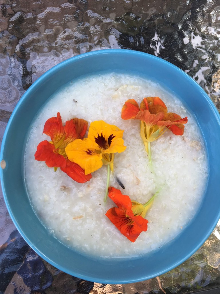 Little one got a bit heavy handed but she still ate all the congee… even if she did spit out the nasturtiums… into my bowl.