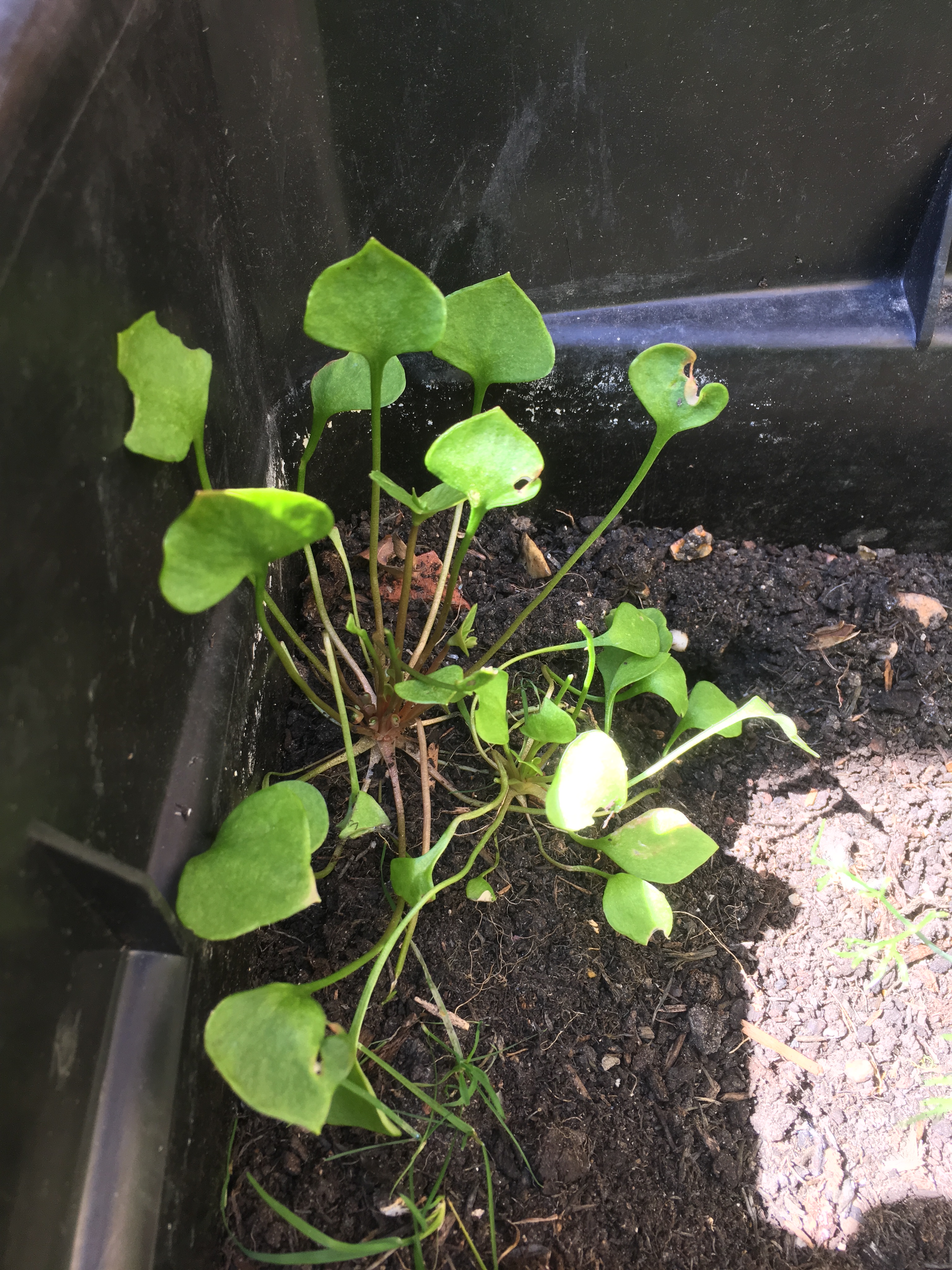 This one took me a while to track down as it seems really hard to find seeds for it. I was determined to get this shade loving perennial with cute pink flowers. I figured that they’d be as wonderful as the winter purslane. I found that they didn’t germinate very readily, unlike the other two. I was really excited when it finally grew and I put it in the shadiest spot in the garden. It didn’t grow particularly lush and over the past 4 months it hasn’t done much. I then tasted it and it was bitter and yucky. I’m afraid I’m not convinced. Maybe my seeds came from some cross breeding and weren’t very good. I’ll have to see what happens over winter. Maybe it will perk up and taste better.