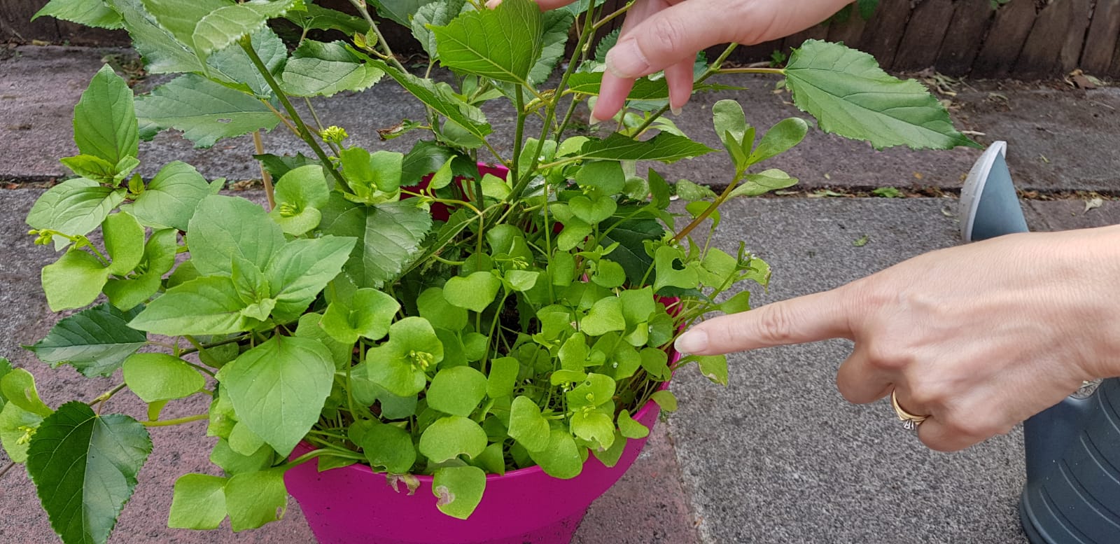 This starts with cordate (sort of upside-down heart shaped-ish) leaves that are succulent, but not quite as thick as the summer purslane. The stems are just as juicy though. As the plant matures it begins to send up round leaves that have a tiny white flower in the centre. All these are edible too. Winter purslane tastes more lettuce like, so it provides a nice, easy to grow salad leaf. It thrives in the shade (does great in part sun, will flower and go to seed quite quickly in full sun) and can be sown July-September. The best things about this plant is that it provides salad leaves through the winter, hence the name. The first year we grew these, we made a lovely salad on Christmas Day – just because we could! This one really does self-seed like crazy and we found them in pavement cracks and pots that had been nearby. It was quite nice harvesting whilst weeding the paving stones. I’ve not sown these again since the first time and it comes up itself in two flushes yearly. They first appear in April and grow quickly, flowering and dying back in June. Then they appear again around August and grow more slowly over the colder months, before flowering and dying as spring comes. My little one absolutely loves these and will graze on them in the garden. Occasionally she will go and ‘pick a salad’ which consists mostly of winter purslane, dill and mint.
