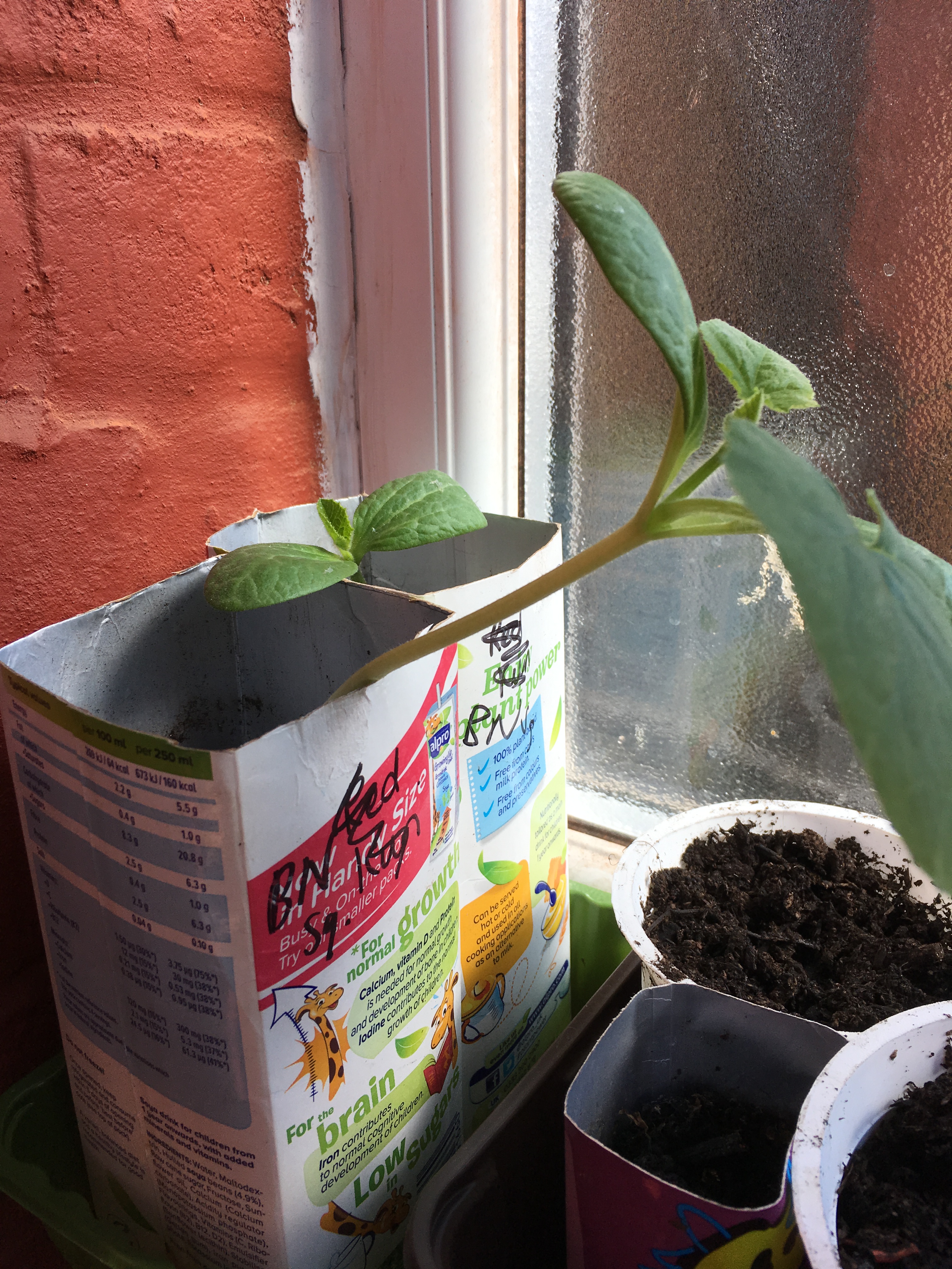 So, early February is the time to start preparing containers for my first batch of early indoor sowing. I have been collecting plenty of food containers over the winter so that I have lots of pots ready to go. I tend to collect old milk cartons, juice cartons, plastic bottles, grape boxes and mushroom trays. The tetra pack cartons I always cut little holes in the bottom or occasionally cut the whole base into a flap and then stick the whole carton into the soil to provide a bit of extra protection from slugs and snails. I have written lots about this in a previous blog ‘Sowing seeds’. I don’t usually care how my pots look but it’s a nice little project to do with the little one. It’s a great opportunity to show her a few new ways to reuse things. We try and keep old wrapping paper, cartons, cardboard and pretty bits of packaging for her to use to make things with – so repurposing is often at the back of her mind.