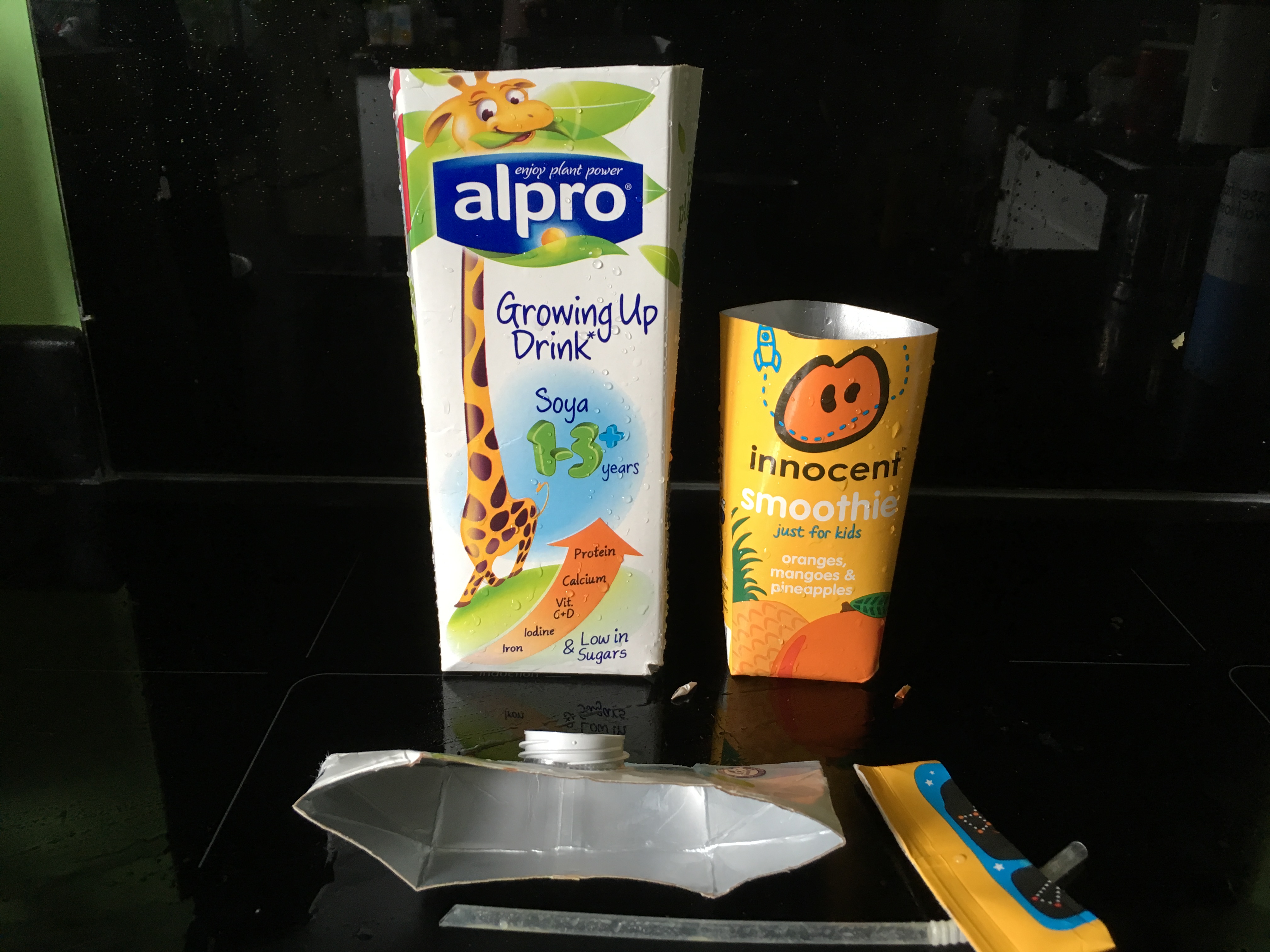 Tetra Pak cartons – If you pull out the side tabs and flatten the top they cut easily. You can also cut a corner on the bottom to allow for drainage.