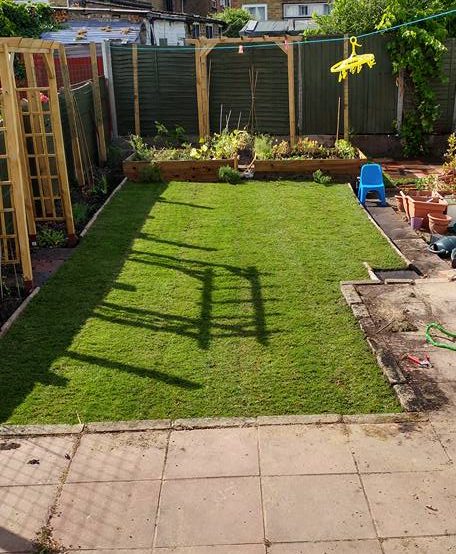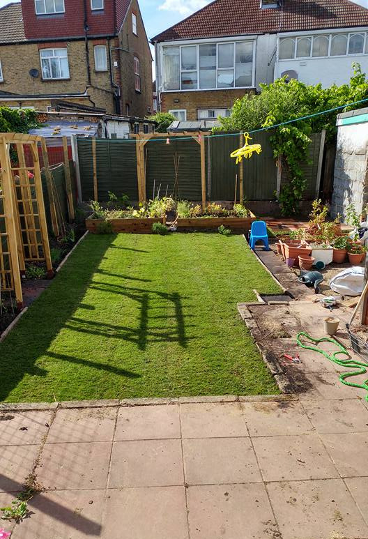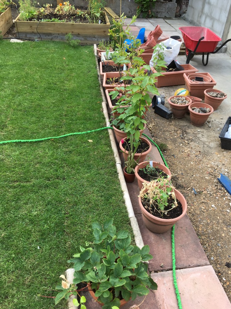 As I dug up the garden (to lay the lawn) there were edging stones and bricks that I was able to reuse to make the edge of the lawn or border the beds. I kept part of the patio (though it’s not particularly nice to look at) because it meant less work, less waste to shift and it is still functional. I kept some of the flagstones to make paths elsewhere. I used some of the flagstones to provide a sturdy base for the shed to go on. I kept a few bags of sand to use under the paths or for future projects. Old solar panel rails made a blackberry support and uses up otherwise empty space.