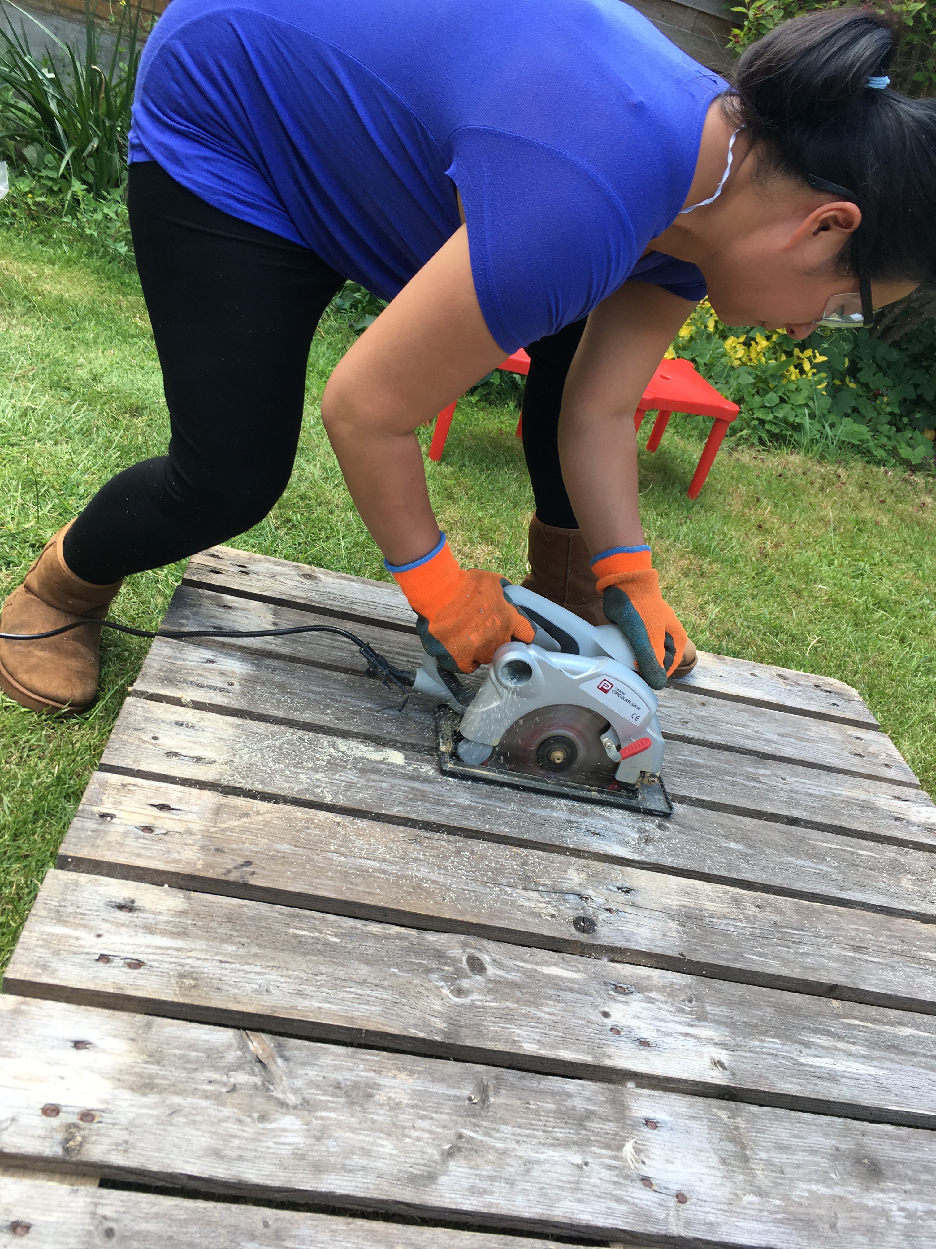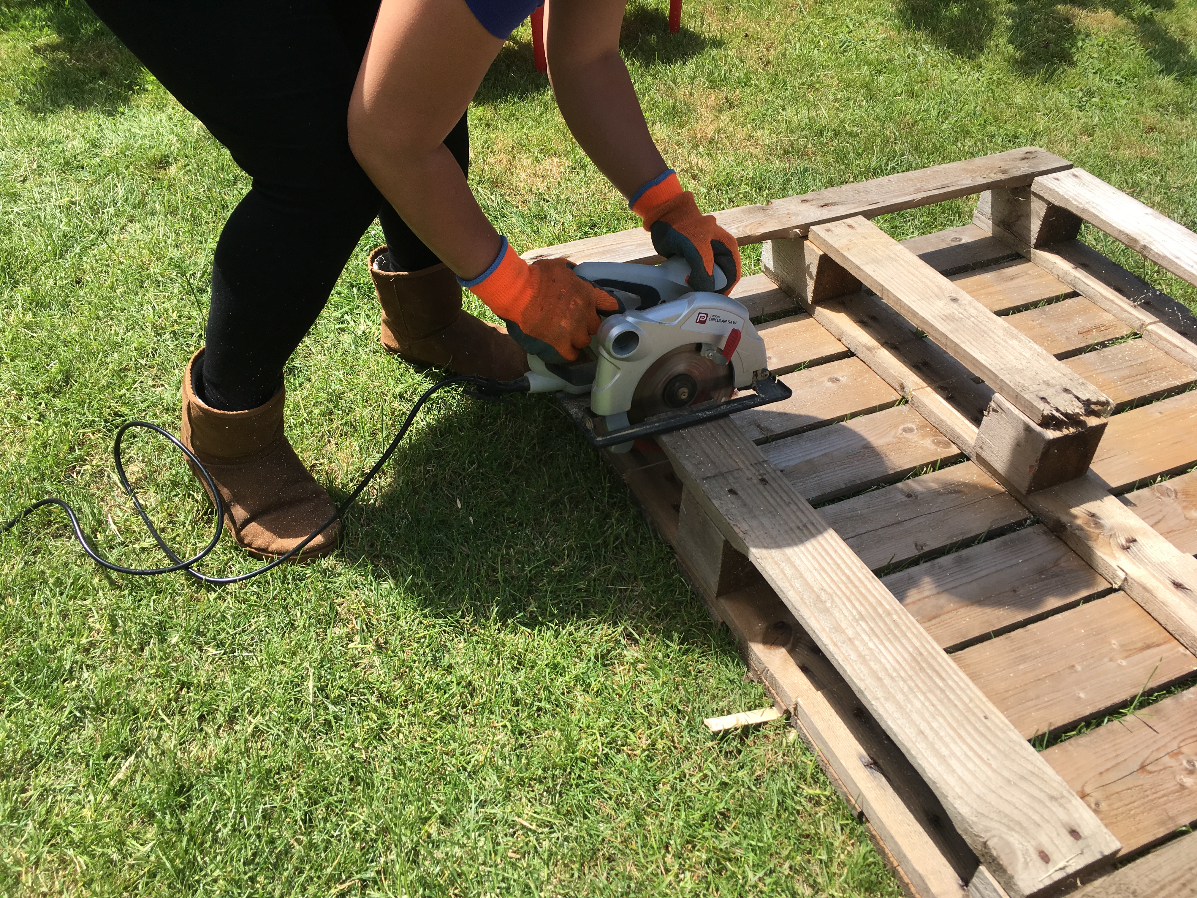 Here we removed most of the bottom frame of the pallet. We kept 2 edges to support the base, but also mostly because we were too lazy to remove them. We kept all of the blocks for something to screw into during assembling.