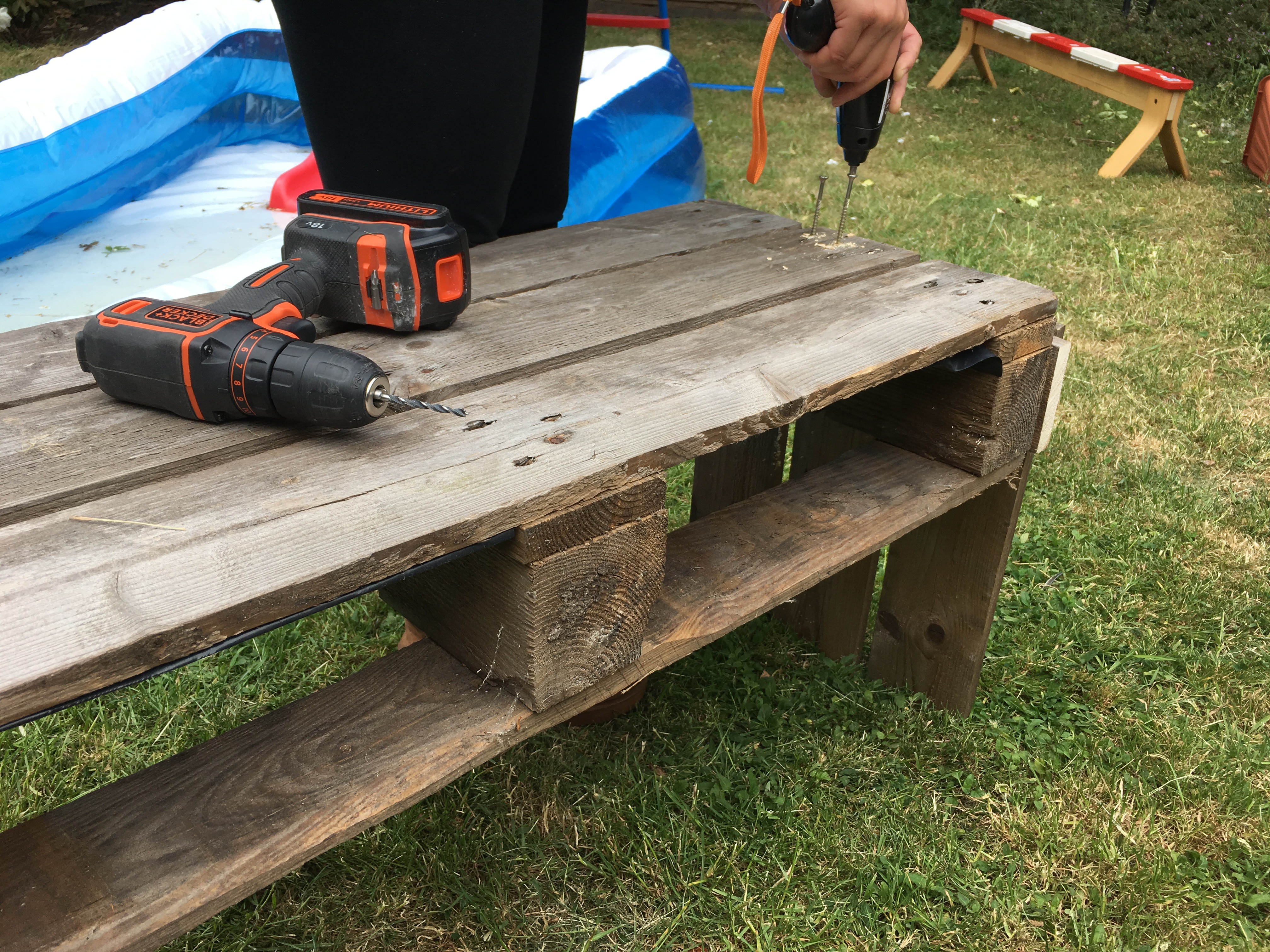 - Screws – length and number depends on your pallet and how many pieces of wood you need to go through and how you’re putting it together. The pallet you have may be very different to the one I used. Here’s your chance to get creative! If in doubt about 30 self tapping wood screws around 5cm in length should do. They will typically be phillips (cross head) screws. Self tapping means you shouldn’t need to drill a thinner hole into the wood first.