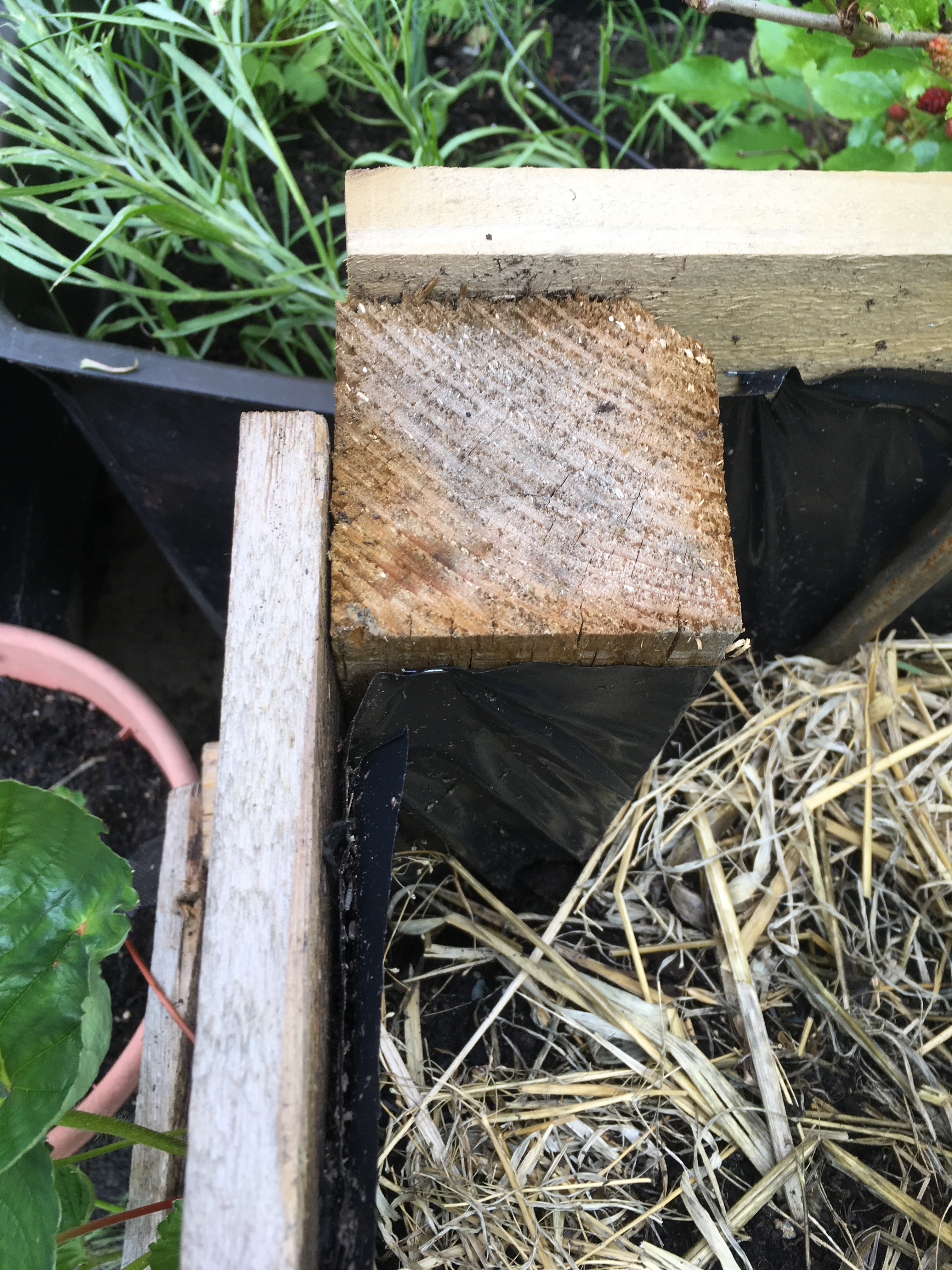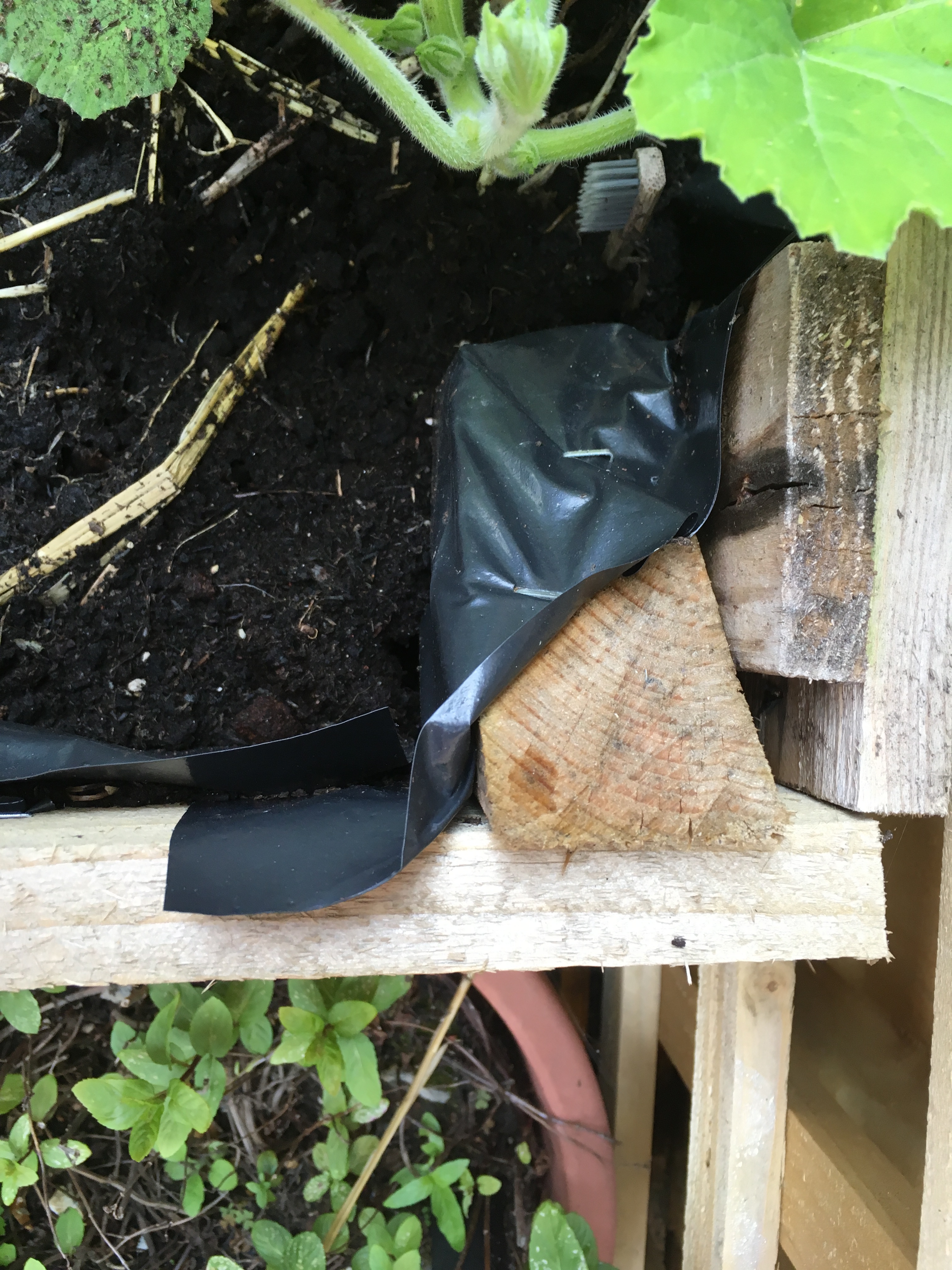 - I stupidly cut the plastic sheet all along the whole length of the slat so compost kept pouring out onto the strawberry plants in the front. I’ve had to prop it up with bits of bamboo canes.