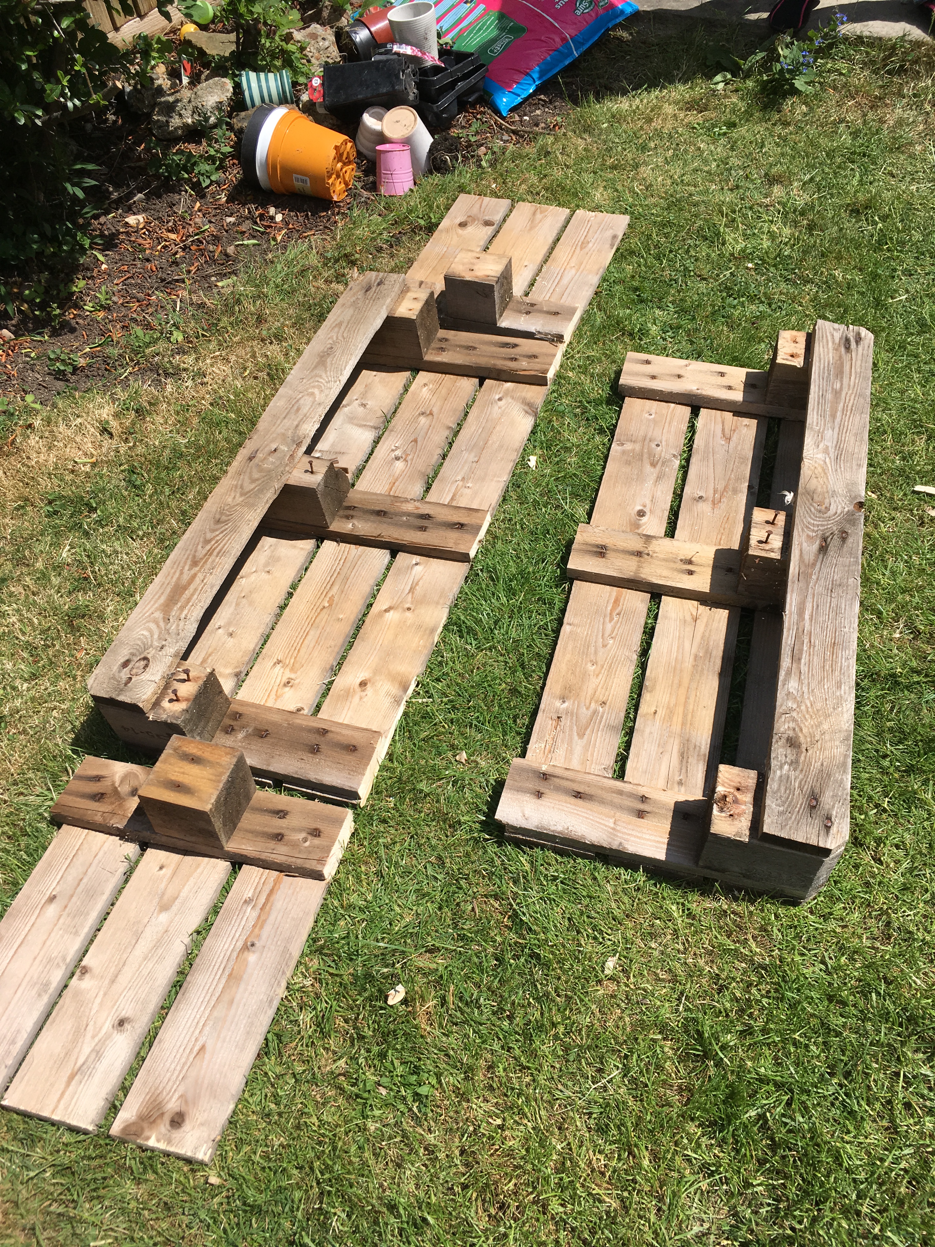 - You need 2 pallets and, realistically, more than 2 planks of wood on each side. After I realised how flawed this design was I had to keep shoring it up with more spare bits of wood as they became available (I try not to buy wood if I can avoid it and use old shelves and random planks left over from DIY projects).